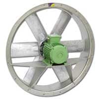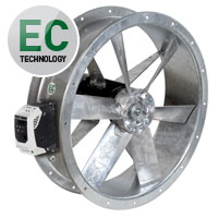 Axialfläkt för ventilation av stora mängder luft. Inställbara aluminiumblad. Kort eller långt fläkthus.
