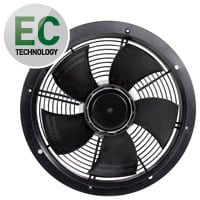 Axialfläkt i kompakt design för kyl- eller värmeapplikationer och är avsedd för inbyggnad eller väggmontage. Med cirkulär väggplatta och med ytterrotormotor i 230V.