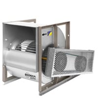 Remdriven radialfläkt med dubbelt inlopp komplett med motor och transmission. För transport av ren luft och icke aggressiva gaser och ångor. Fläkthjul medframåtböjda lameller, F-hjul.